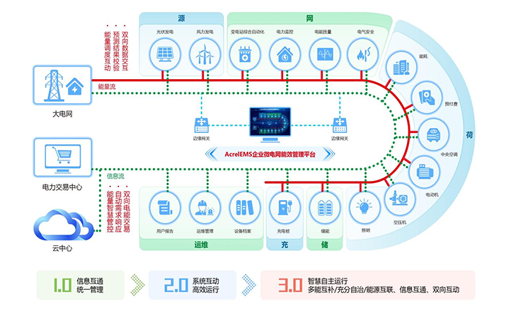 簡介:1.概述 通過在源、網(wǎng)、荷、儲、充的各個(gè)關(guān)鍵節(jié)點(diǎn)安裝監(jiān)測、分析、保護(hù)、治理裝置, 通過高性能邊緣計(jì)算網(wǎng)關(guān)采集數(shù)據(jù)并上傳至企業(yè)微網(wǎng)平臺。平臺根據(jù)新的電網(wǎng)價(jià)格、 用電負(fù)荷、電網(wǎng)調(diào)度指令等情況,調(diào)整各系統(tǒng)控制策略并遠(yuǎn)程下發(fā),使企業(yè)微電網(wǎng)始終高效穩(wěn)定運(yùn)行, 降低企業(yè)用電成本,實(shí)現(xiàn)能源互聯(lián)、信息互動(dòng)。 2.應(yīng)用場所 適用于各行業(yè)企業(yè)內(nèi)部微電網(wǎng)管理系統(tǒng)的新建、擴(kuò)建、改建等項(xiàng)目。 3.平臺結(jié)構(gòu) 3.平臺功能 安科瑞AcrelEMS企業(yè)微電網(wǎng)能效管理平臺融合了電力監(jiān)控、電氣安全、照明控制、能源管控、充電樁運(yùn)營管理、分布式光伏監(jiān)測、儲能管理、設(shè)備臺賬、運(yùn)維管理等功能,通過一個(gè)平臺、一個(gè)APP整體的對企業(yè)用電進(jìn)行集中監(jiān)控、統(tǒng)一調(diào)度、統(tǒng)一運(yùn)維,并且根據(jù)當(dāng)?shù)毓╇姴块T錯(cuò)峰避峰計(jì)劃提前為企業(yè)制定錯(cuò)峰避峰方案和預(yù)警,滿足企業(yè)